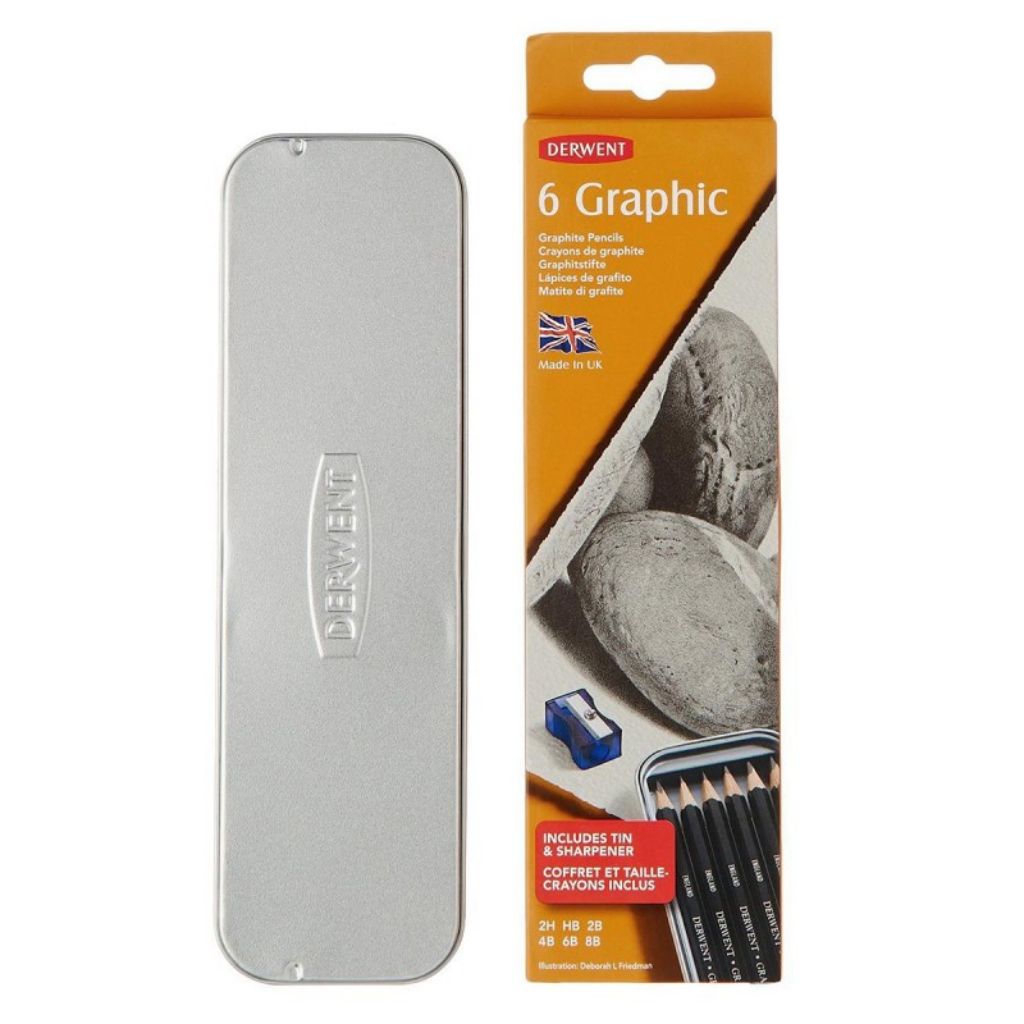 Derwent Graphic Graphite Pencils Tin With Pencil Sharpener Set Of