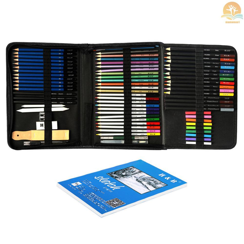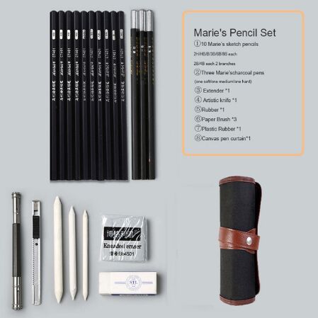 33 professional drawing tools includes 18 drawing pencils 3 charcoal pencils 1 white charcoal pencil 2 woodless pencils 1 black inkonic fineliner pen 3 paper blenders 1 metal sharpener 3 erasers and 1 hobby knife.